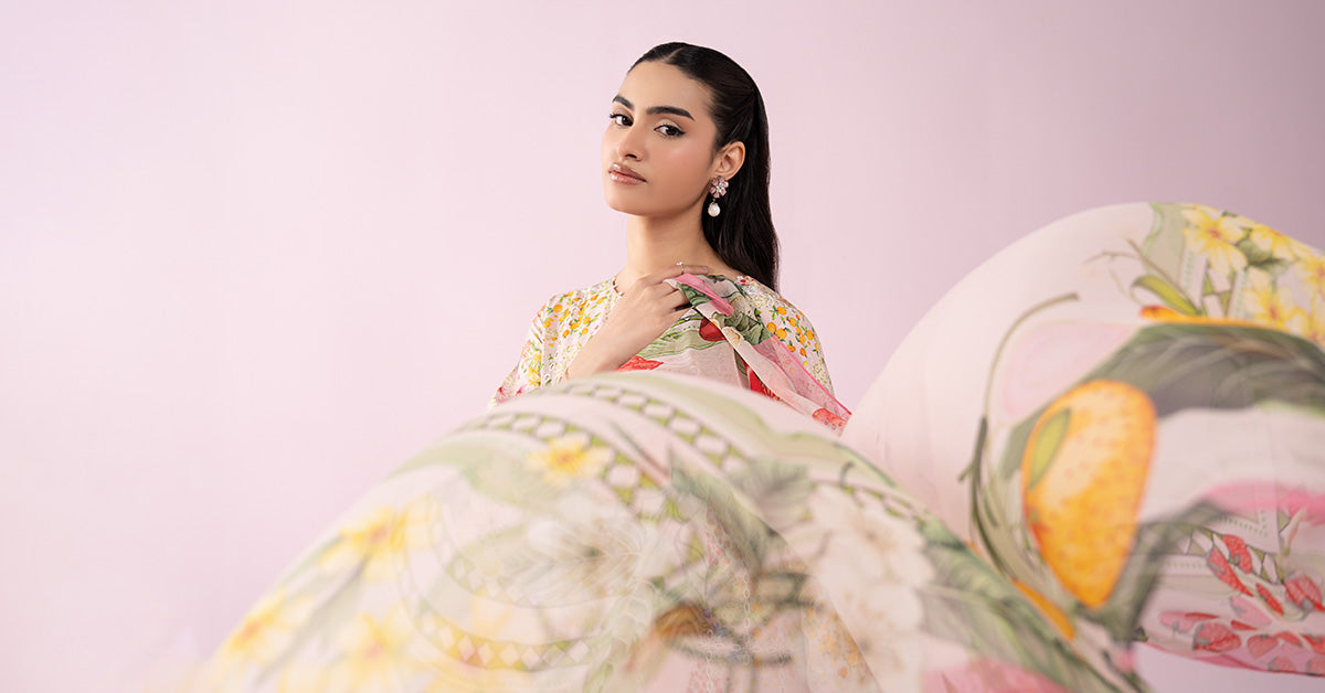 Color: PeachShirtPrinted Straight-Cut Shirt With EmbroideryRound Neckline With Pearls & Buttons DetailingEmbroidered Scaloped Border With Pearl Drop HangingPrinted Embroidered Sleeves With Lace Finish & Pearl Drop HangingFabric: LawnTrouserDyed Wide-Leg TrouserElasticated WaistbandFabric: CambricDupattaPrinted DupattaFabric: ChiffonNote: Dry Clean Only