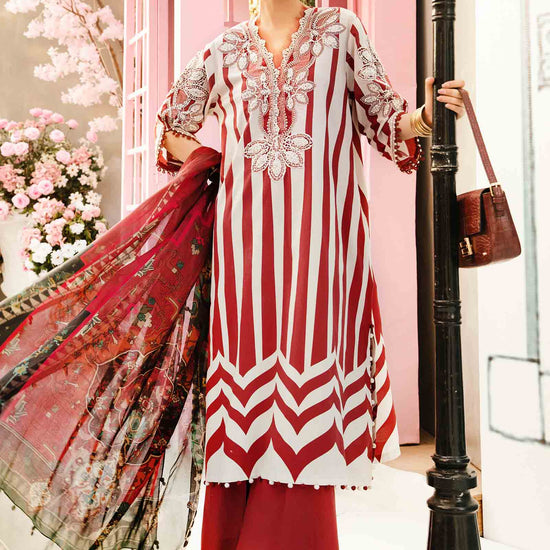 Shirt Printed Lawn FrontPrinted Lawn Back & SleevesEmbroidered Organza NecklineEmbroidered Sleeve PatchesColor: White & MaroonTrousers Dyed Cambric TrousersDupatta Printed Chiffon DupattaNote: Dry Clean Only