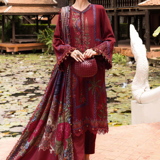 Color: MaroonShirtEmbroidered Twill Linen Center PanelEmbroidered Twill Linen Front R+L PanelsEmbroidered Twill Linen PattiDyed Twill Linen Back & SleevesTrouserDyed Linen TrouserShawlPrinted Wool ShawlNote: Dry Clean Only