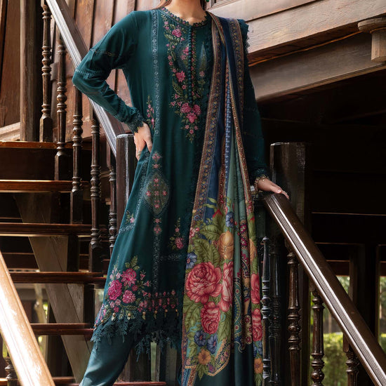 Color: TealShirtEmbroidered Twill Linen Center PanelEmbroidered Twill Linen Front R+L PanelsEmbroidered Twill Linen PattiDyed Twill Linen Back & SleevesTrouserDyed Linen TrouserShawlPrinted Wool ShawlNote: Dry Clean Only