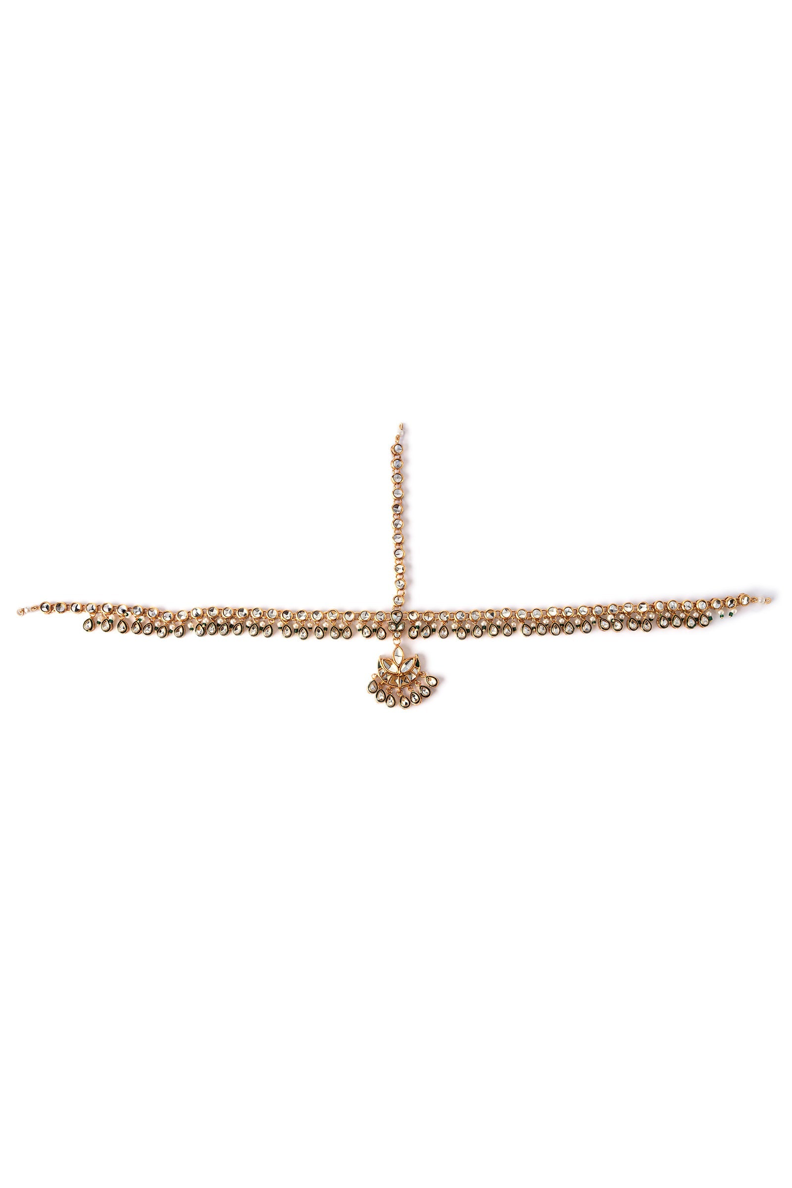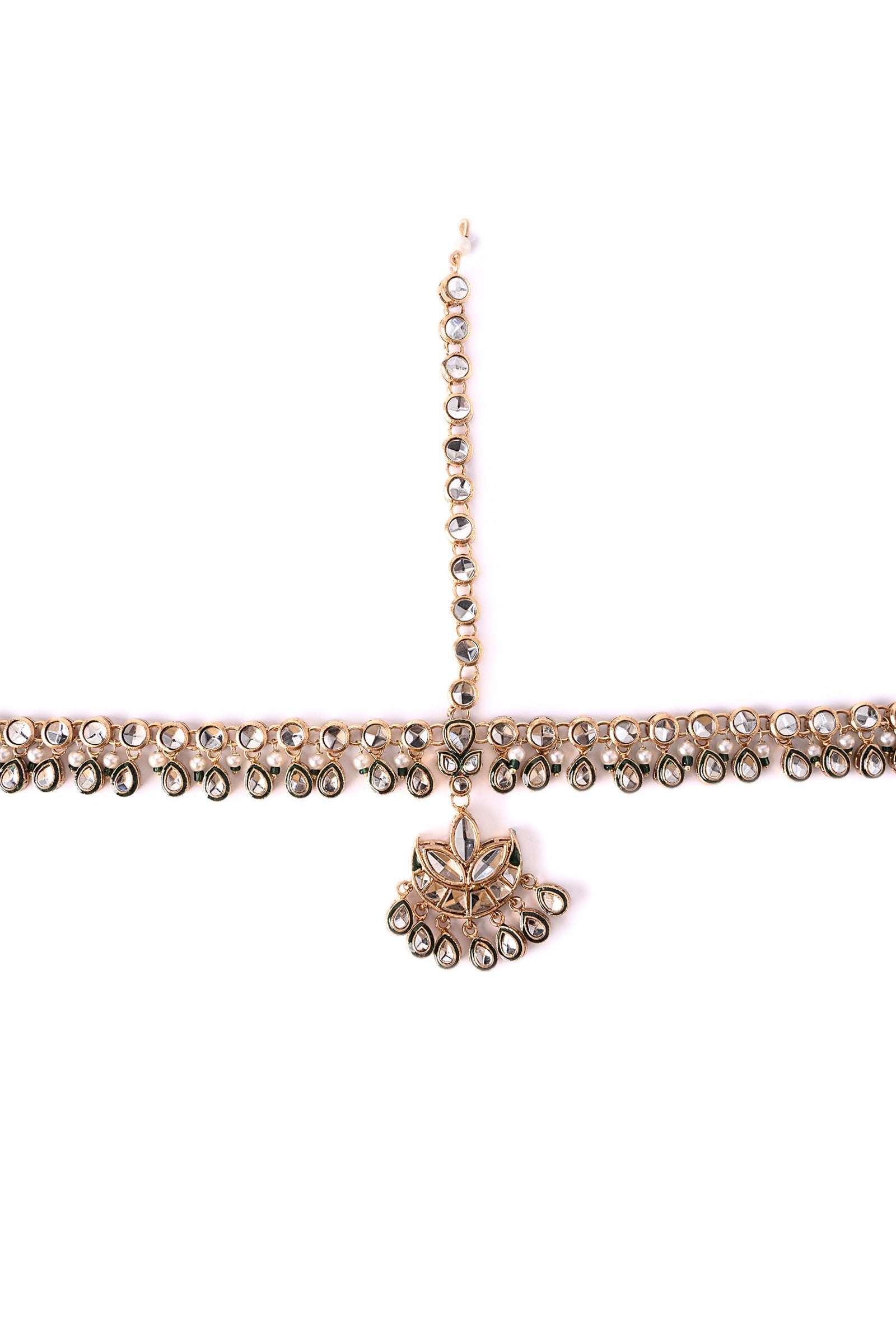Complete your look with our Nermin Math Patti - Designed delicately with handcut glass stones framed with heavenly pearls pyroi. To highlight the aesthetics, it is glistened with green enamel and green poth, making it a glamorous choice for an elevated look. Finish: 21K Gold Plated Product Care: Wipe Clean