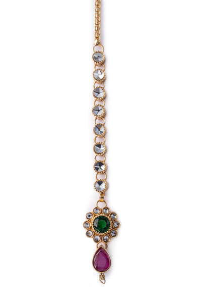 Graceful yet classic; our kid's Nurul Tika is laid out with handcut glass artistry in a delicate design. These glistening stones are clustered around the emerald green stone with a pink Chatham drop making it a perfect choice for adding sophistication to your princess's festive look.