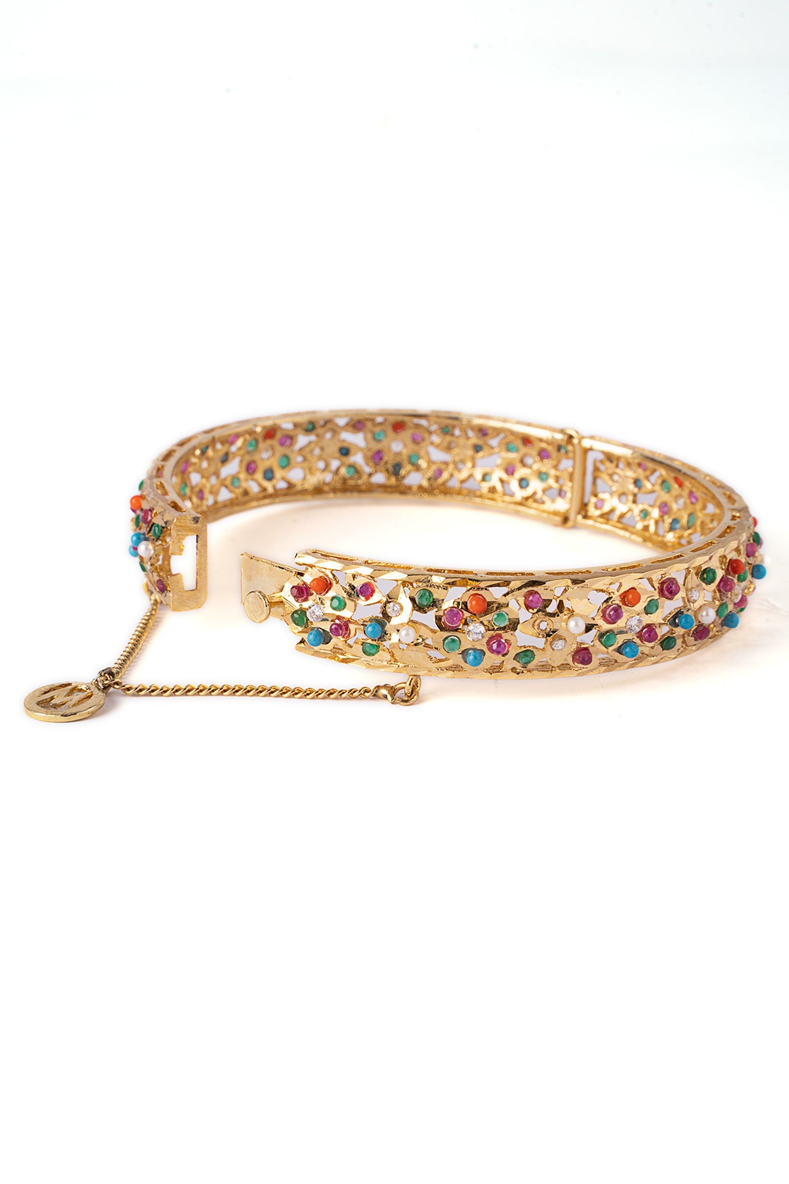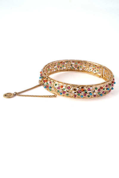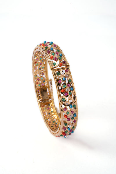 Bringing the classic vibes with a twist - our Pearl Petal Churi showcases intricate florets crafted with multicolor stones and pearls, highlighting the beauty of this masterpiece it is finished with zircons artistry, making it an elegant yet classic choice for your desi festivities.