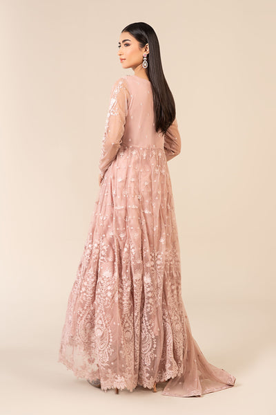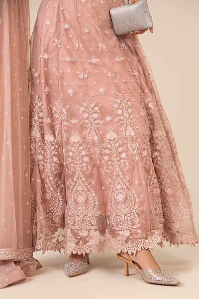 Long panelled frock with embroidered panels and yoke with embroidered border on sleeves and hem Crystal and stone work on neckline Paired with matching straight pants and embroidered dupatta with embroidered border on pallu