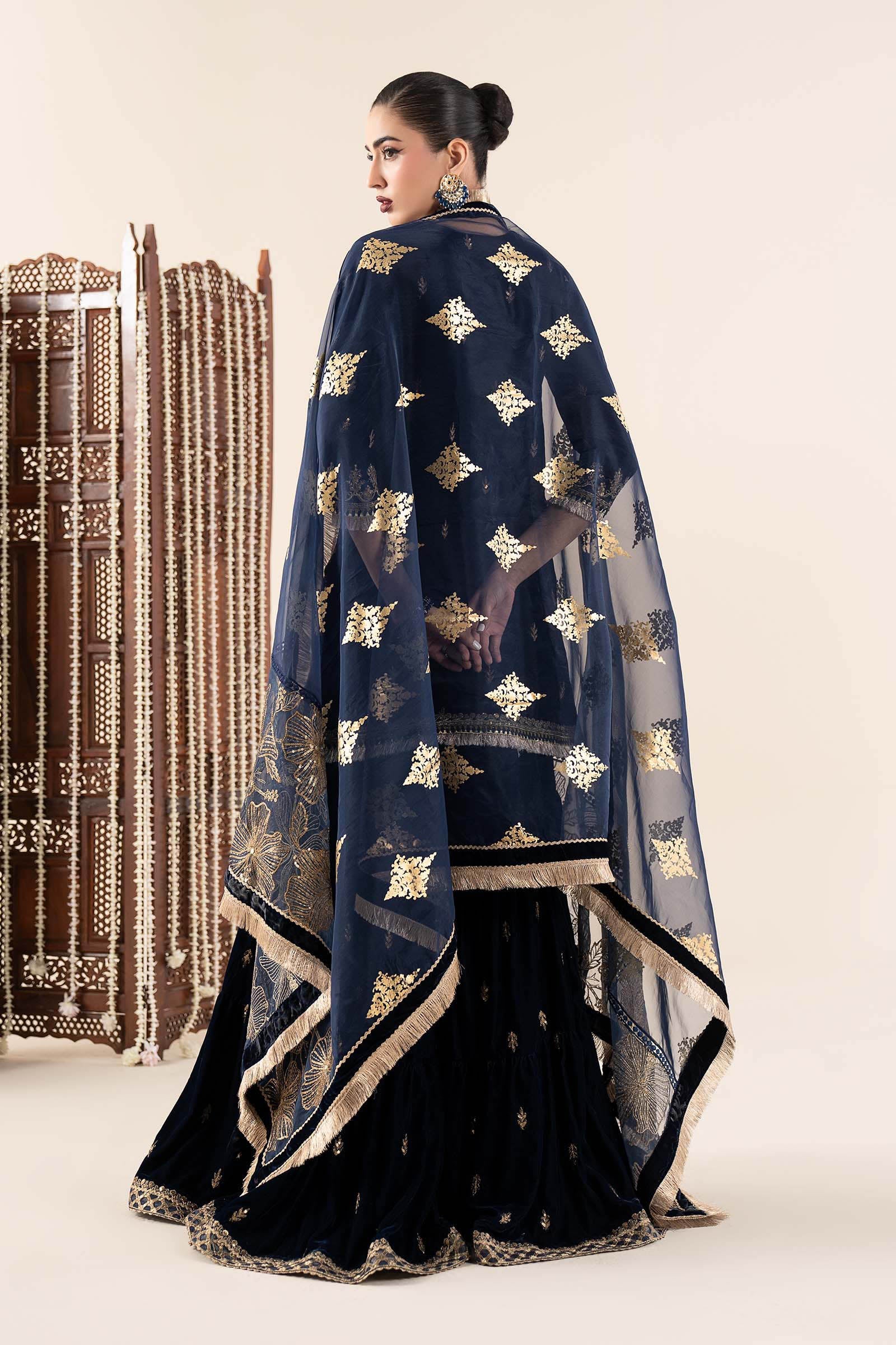 ShirtSpray Embroidered ShirtRound Neckline With Lace DetailingEmbroidered BorderEmbroidered SleevesKiran, Gotta & Lace Detailing On Sleeves & BorderTassel Detailing On Back NeckColor: Navy BlueFabric: VelvetGhararaSpray Embroidered GhararaElasticated WaistbandEmbroidered BorderColor: Navy BlueFabric: VelvetDupattaDyed Dupatta With Screen Printed & Embroidered BorderFour-Side Velvet Border With Kiran & Gotta Lace DetailingColor: Navy BlueFabric: OrganzaWork Details: Sequin & Tilla EmbroideryModel is wearing xs sizeNote: Dry Clean Only
