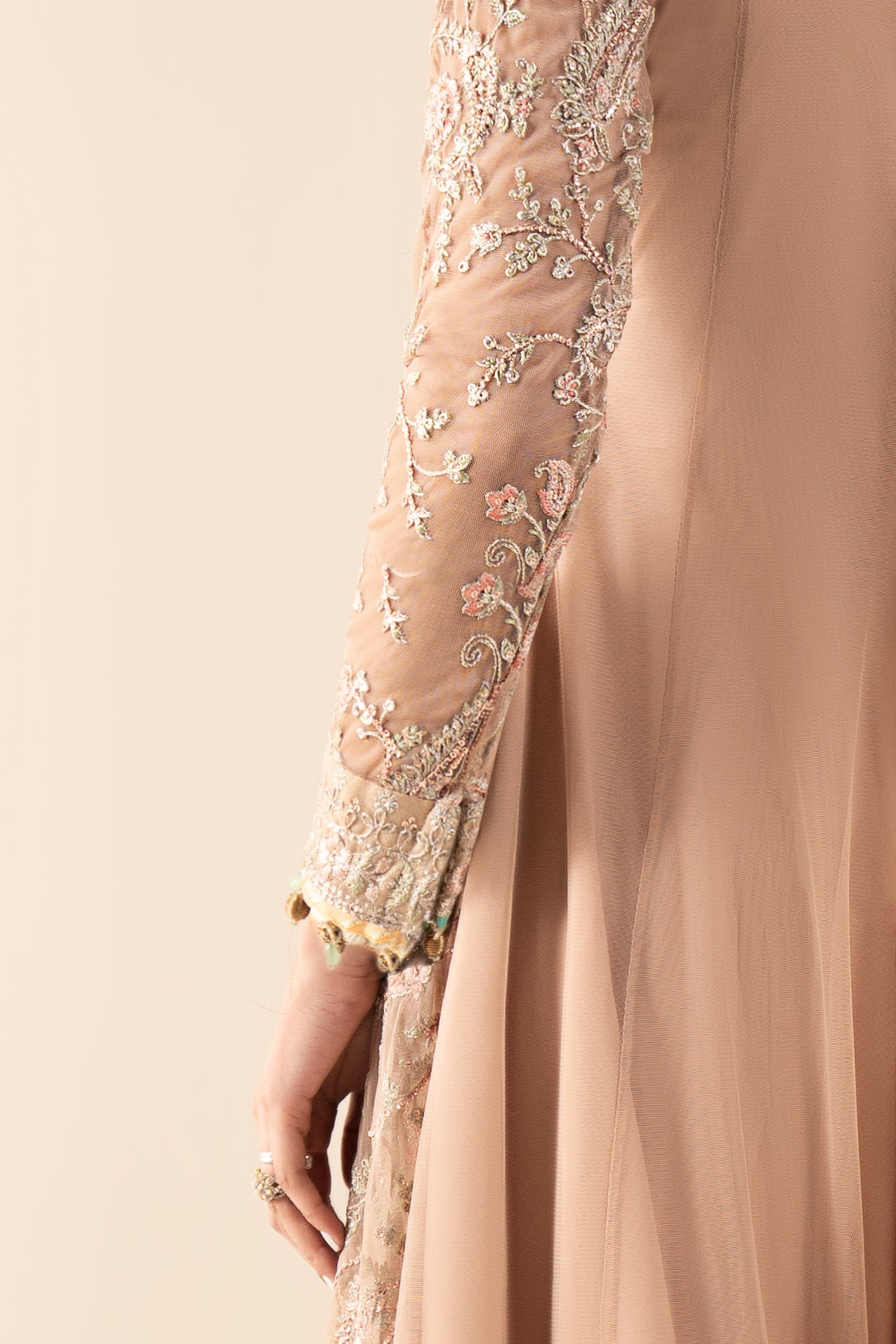 Embroidered Fitted Sleeves With Pearl & Crystal Ball Drop Detailing