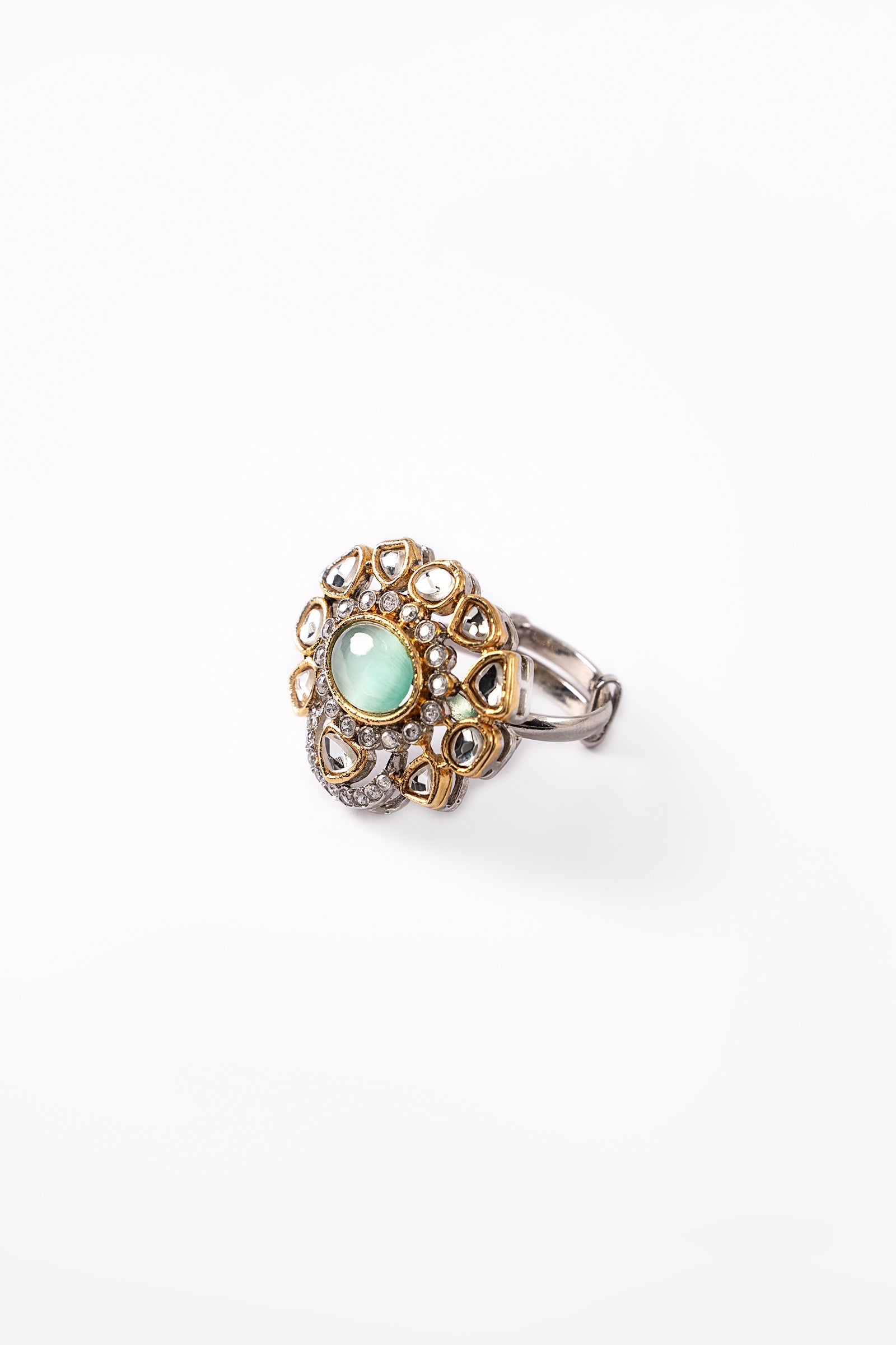 Our stunning Sultana Bridal Set is a special addition to our heritage. Intricately curated with handcut glass stones with mint cats eye and white zircons, it features an elegant yet modern design that makes it ideal for your big day look. It has a necklace, earrings, and a ring.Finish: Gangajamni (21K Gold & Silver Plated)Back Pin: Sterling Silver StudRing Size: AdjustableProduct Care: Wipe Clean