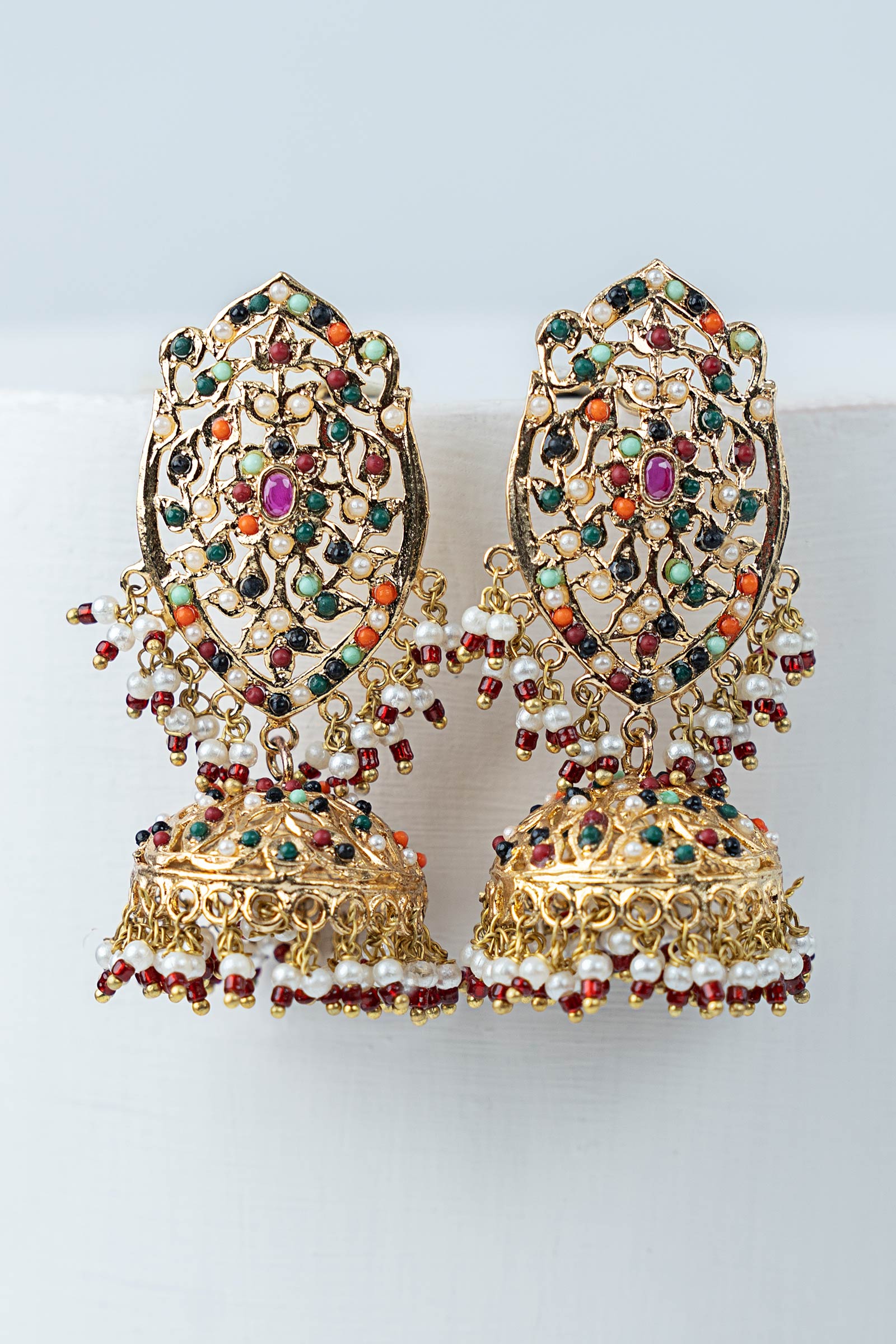 An ode to timeless beauty, these handcrafted earrings bring together the soft glow of pink chatham with a vivid cascade of green, orange, red, mint green, and blue pearl pyroi. Accented with a striking red poth, each element tells a story of tradition, artistry, and festive elegance — perfect for making a graceful statement.