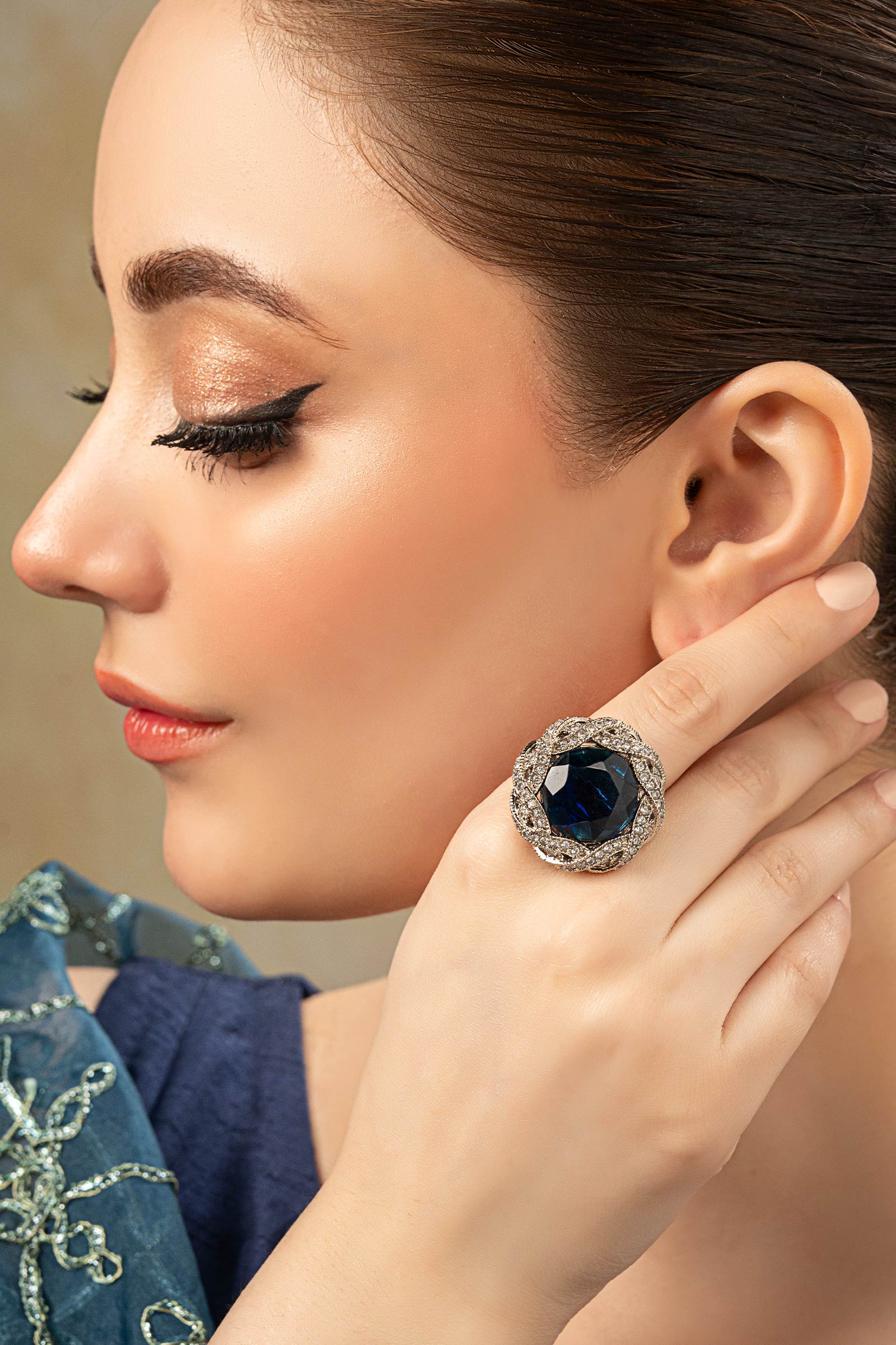 Add statement to your style with our Twisted Ring - It features a white zircon-embellished twisted frame glamorized with a glistening denim blue glass stone, making it an effortless choice to add sophistication and grace to your overall look.