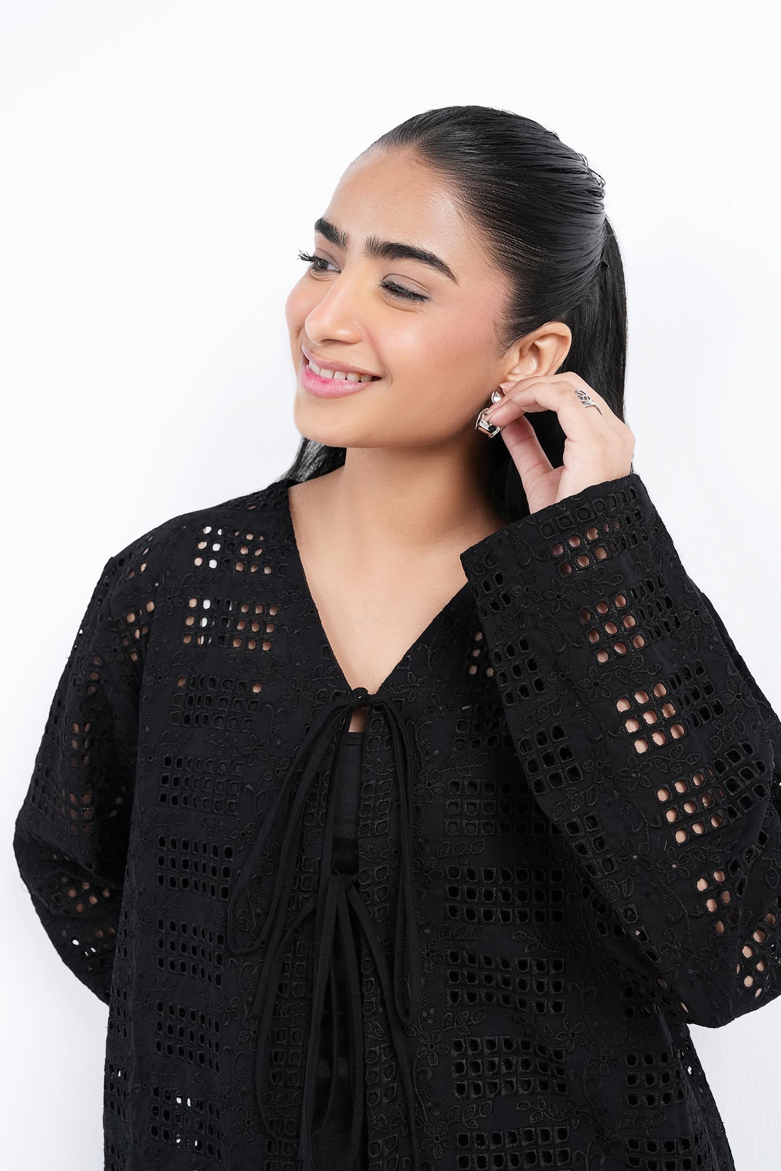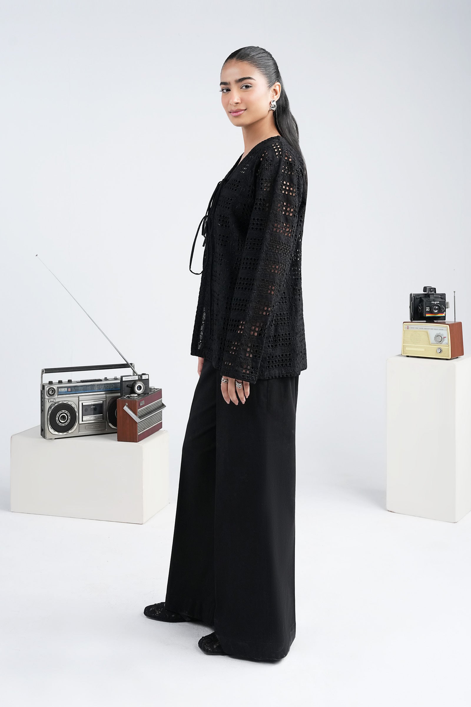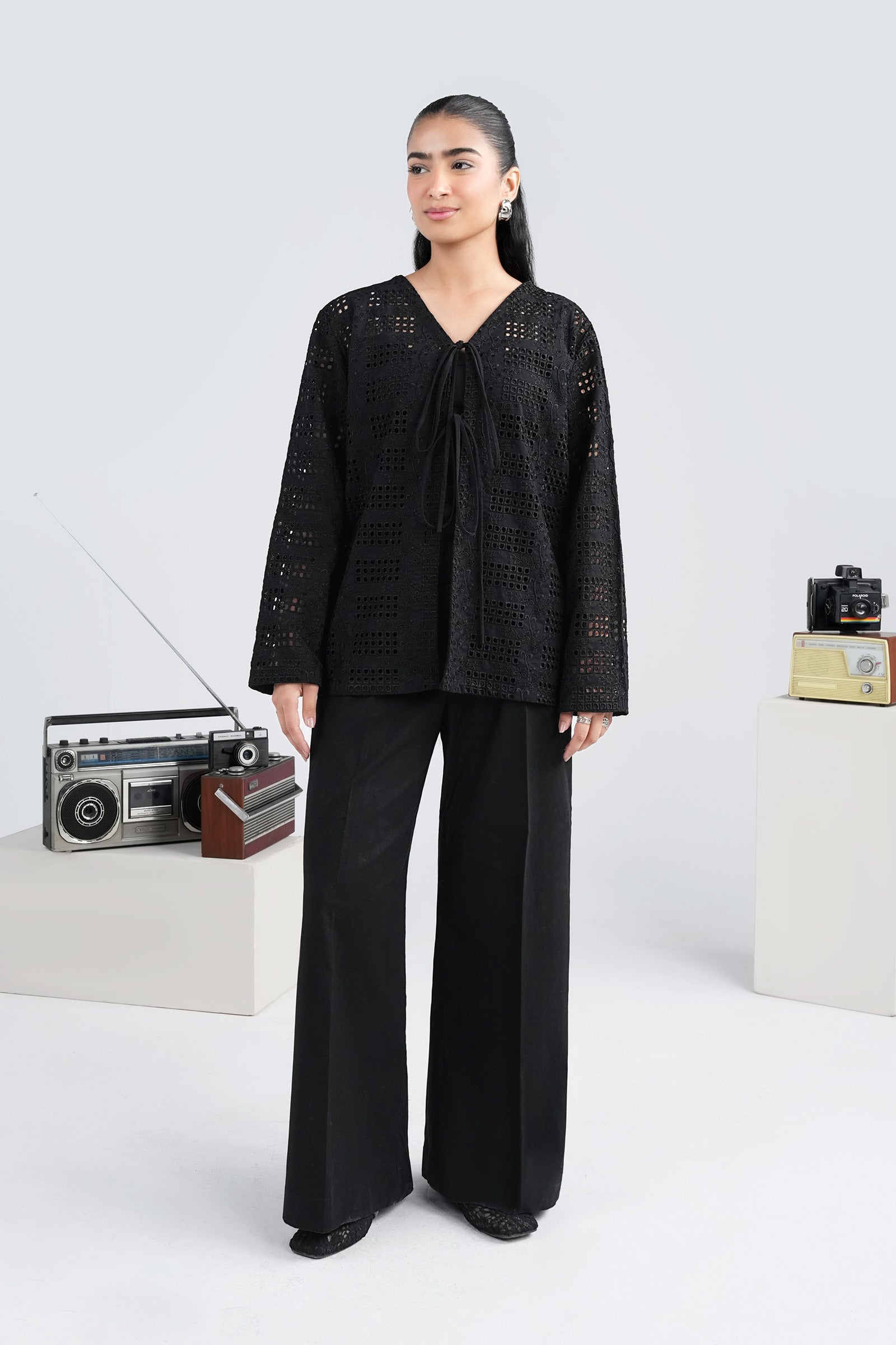 Top: Schiffli Embroidered Front Open TopPants: Elasticated Wide Leg TrousersMaterial: Linen CottonColor: BlackStretch: NoneFit: RegularNoteDry Clean OnlyDo Not BleachIron On Medium Heat SettingsNote: The model is wearing an inner (not included)