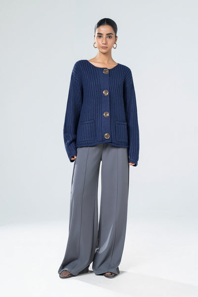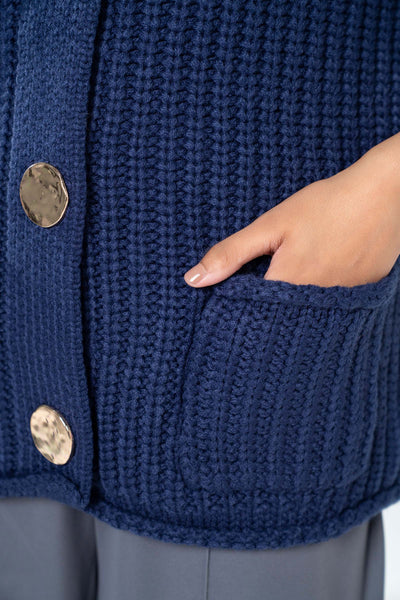Round Neckline Cardigan With Statement Gold Buttons, Slightly Dropped Shoulders & Long Sleeves.