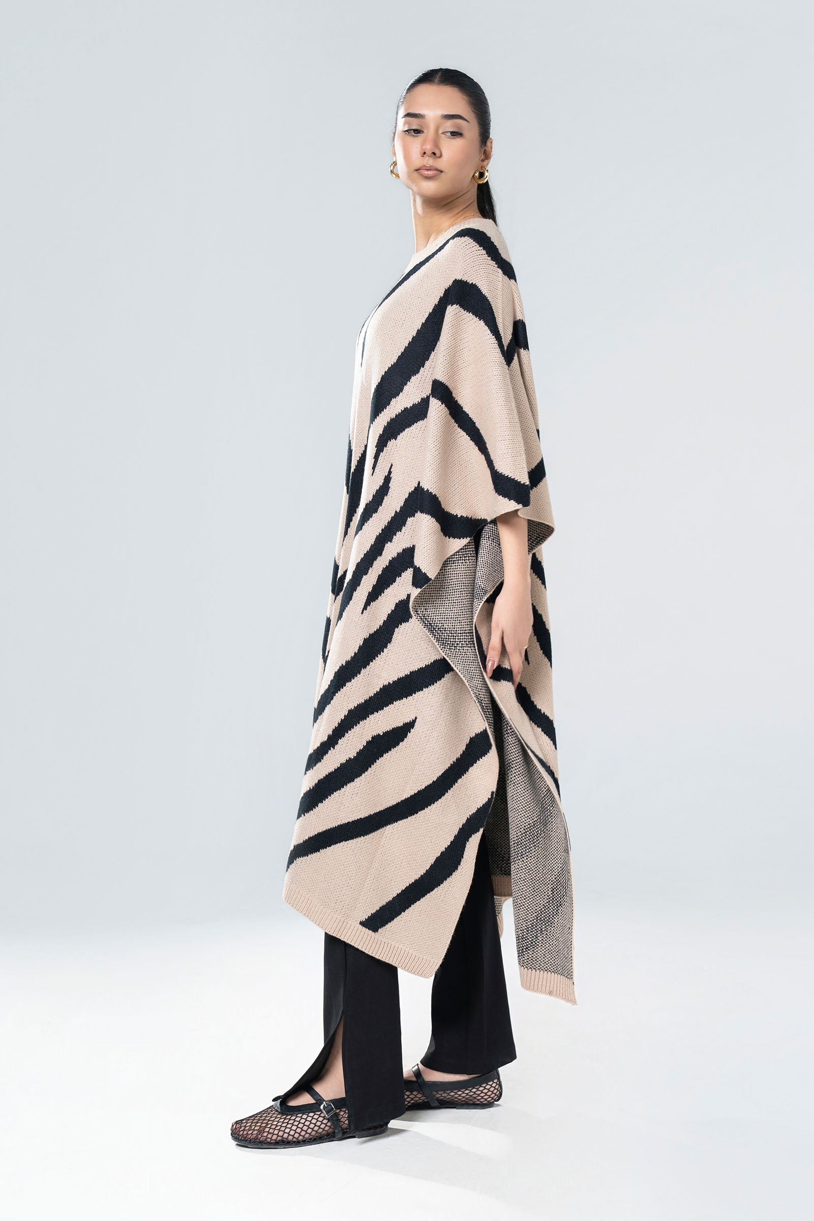 Contrasting Jacquard Knit Oversized Sweater With Ribbed Round Neckline & Long Sleeves.Material: Sweater KnitColor: Black & BeigeStretch: HighFit Type: RelaxedAvailable in XS, S, M & L SizeNoteDry Clean OnlyDo Not BleachDo Not Iron