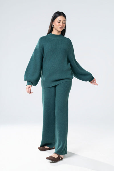 Turtleneck Sweater With Drop Shoulders & Voluminous Sleeves Paired With Wide-Leg Relaxed-Fit Pants.