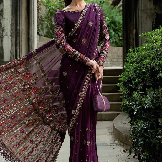 Color: PlumBlouseRaw Silk BlouseHand Embellished Neck PatchEmbroidered Raw Silk Sleeves With 3D FlowersEmbroidered Organza Sleeve PattiSareeEmbroidered Chiffon Saree Pallu & Border With 3D FlowersEmbroidered Chiffon FallEmbroidered Organza Allover PattiPetticoatDyed Silk PetticoatNote: Dry Clean Only