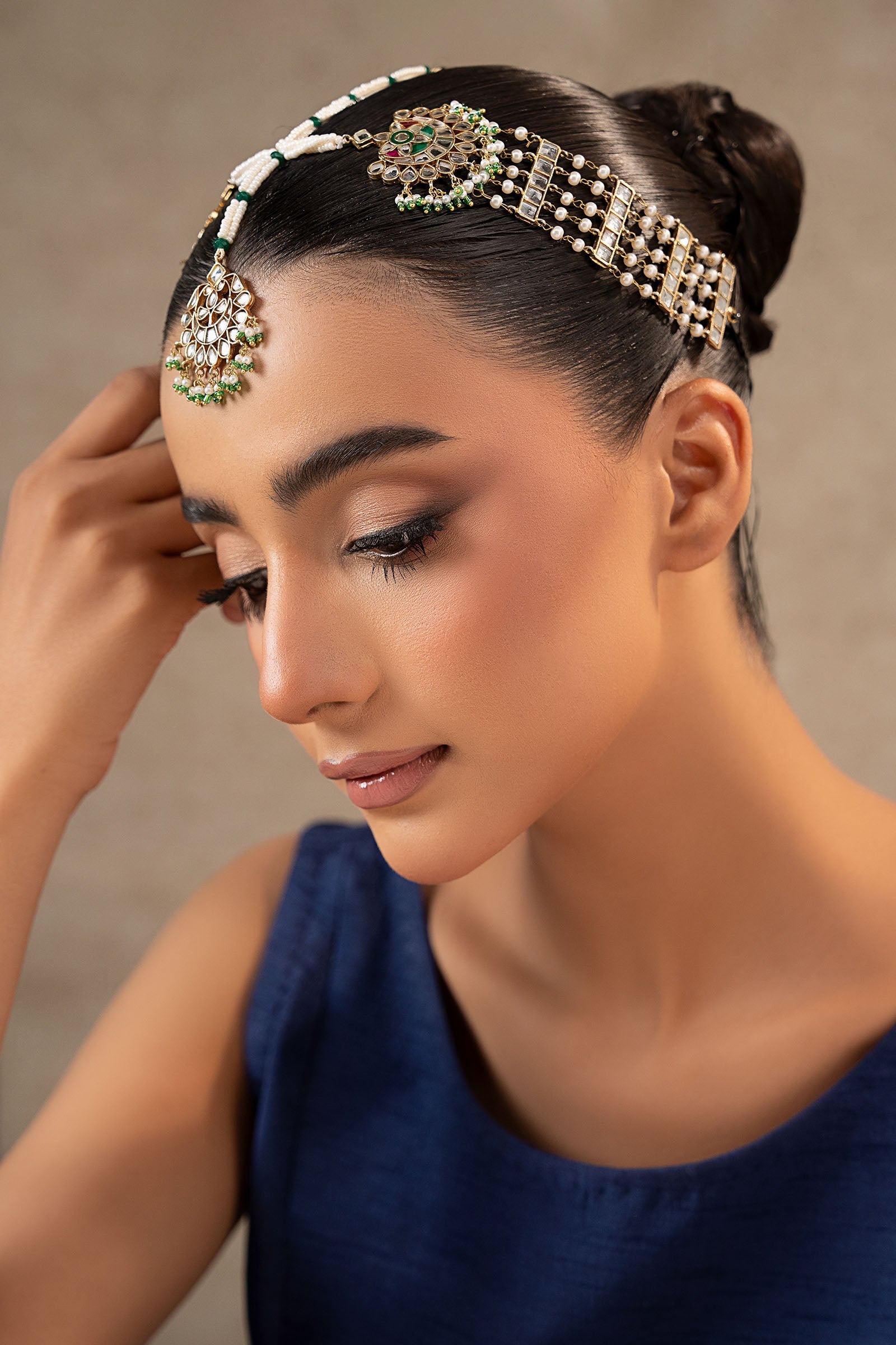This Matha Patti, a royal crown of heritage, combines the depth of green onyx, the glimmer of white handcut glass, and the blush of pink chatham. With each sparkle, its pearls, green enamel, and subtle Indian poth pyroi convey a timeless elegance and festive grace. Finish: 21K Gold Plated Product Care: Wipe Clean